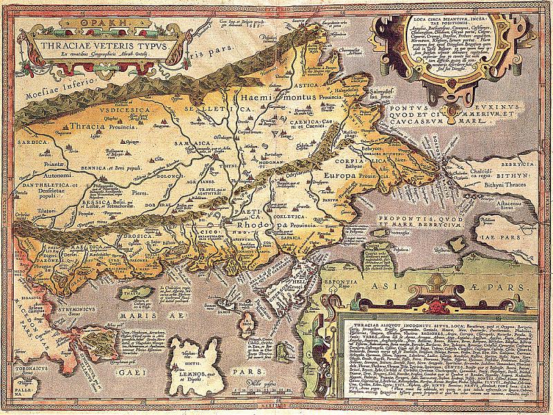 Илюстрацията показва Карта на древна Тракия – 1585 от Абрахам Ортелиус, дарение от Регионален исторически музей – Бургас и Сдружение „Морски сговор” – Бургас за възстановяване на проекта „КАРТОГРАФСКИЯТ ОБРАЗ НА СТРАНДЖАНСКИЯ КРАЙ ПРЕЗ ВЕКОВЕТЕ“ като експозиция на открито на историческата местност Петрова нива.