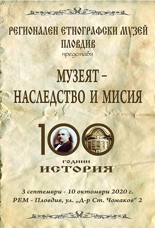 Изложбата „Музеят – наследство и мисия. 100 години история“ проследява историята на музея от създаването му преди повече от 100 години, та до наши дни. Тя представя личности като секретар-уредника Стою Шишков, директора Йордан Попгеоргиев, кмета Божидар Здравков и много други, които са свързали живота си с идеята за изграждане и укрепване на Етнографския музей. Представена е и историята на къщата на Аргир Куюмджиоглу, която през 2017 г. навърши 170 години, нейните стопани, строители и реставратори.