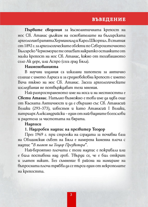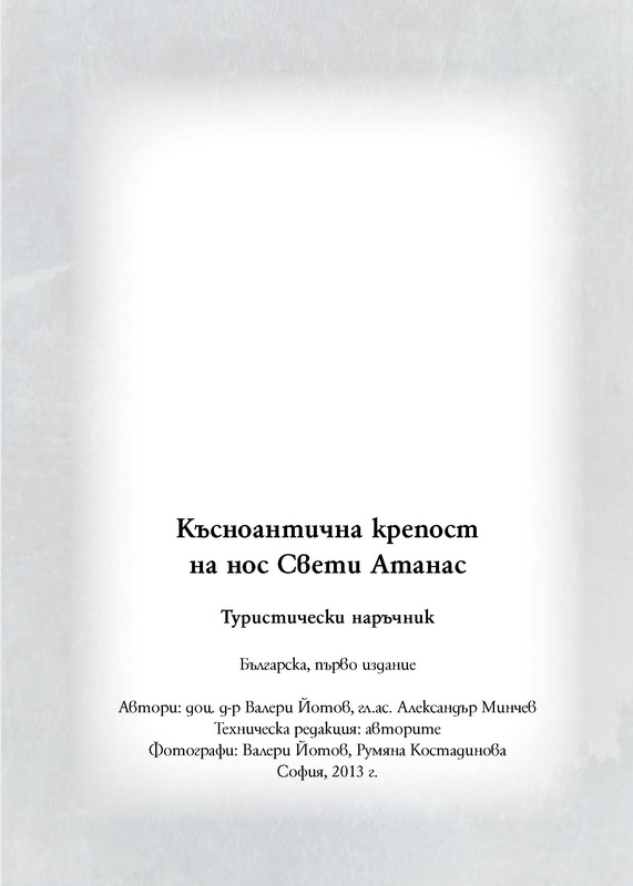 Тази туристически наръчник е създаден в рамките на проект „Консервация, реставрация, експониране и социализация на антично селище и късноантична крепост на нос Св. Атанас и превръщането им във водеща туристическа атракция на територията на Община Бяла, обл. Варна“ финансиран по ОП „Регионално развитие“ 2007 – 2013 г.