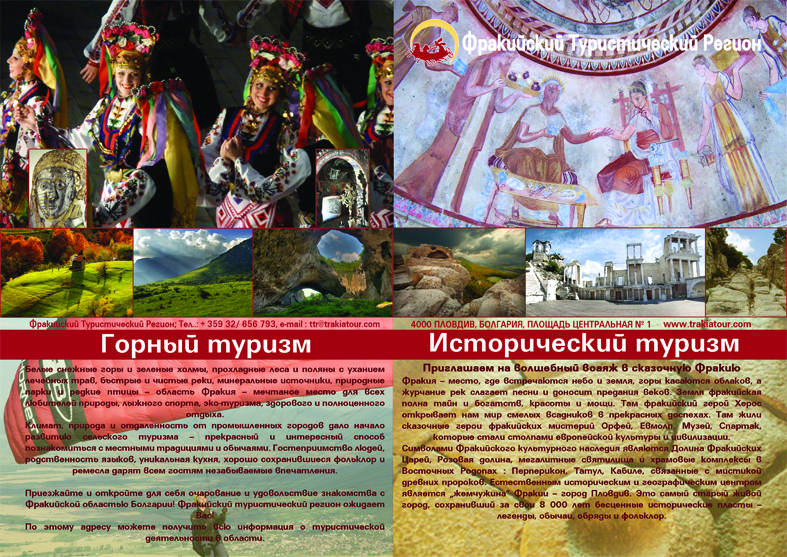 На тази база бе създадена брошура,съобразена със специфика и имидж, характерни ресурси и възможности за практикуване на различни видове туризъмв дестинацията. Изготвената от нас брошура представи възможностите за туризма в ТТР в следните направления: