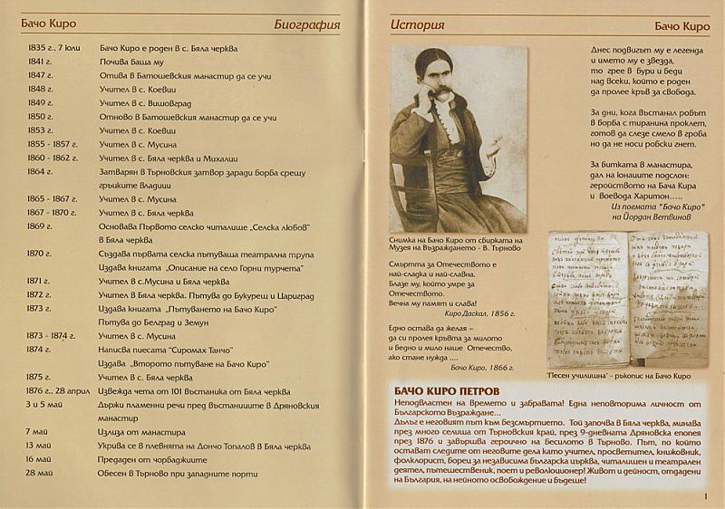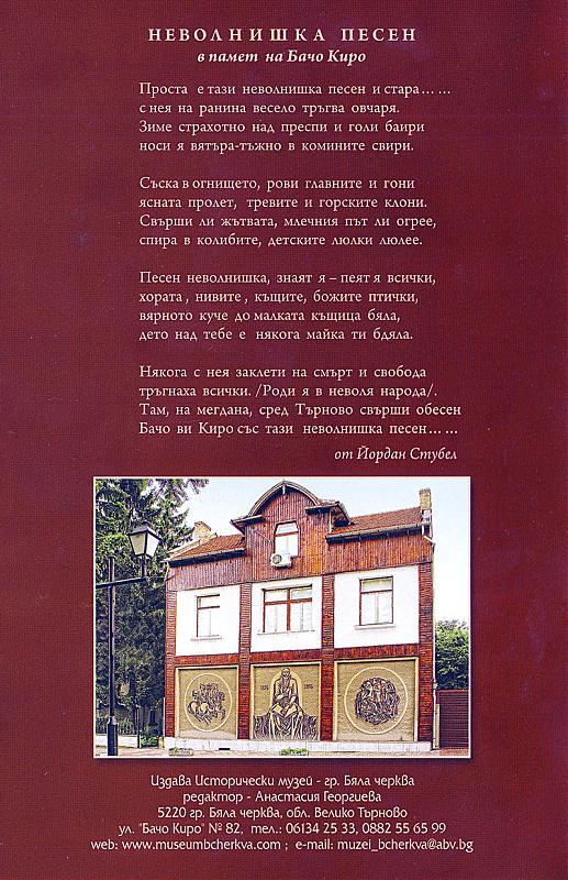 През месец юли 2015 г. Исторически музей – Бяла черква издаде книжка „ Бачо Киро 1835-1876” от 16 страници, която чрез текстове и богат снимков материал представя неговия живот и дейност като учител, просветител, книжовник, борец за църковна независимост, читалищен и театрален деятел, пътешественик, поет и революционер, организатор и вдъхновител на четата с войвода поп Харитон, която геройски се сражава в Дряновския манастир през 1876 година. Книжката съдържа кратка биография и родословие на Бачо Киро, негови мисли, стихове и откъси от слова, съчинения и летописни бележки. По-голямата част от фотографиите са от фонда на музея.