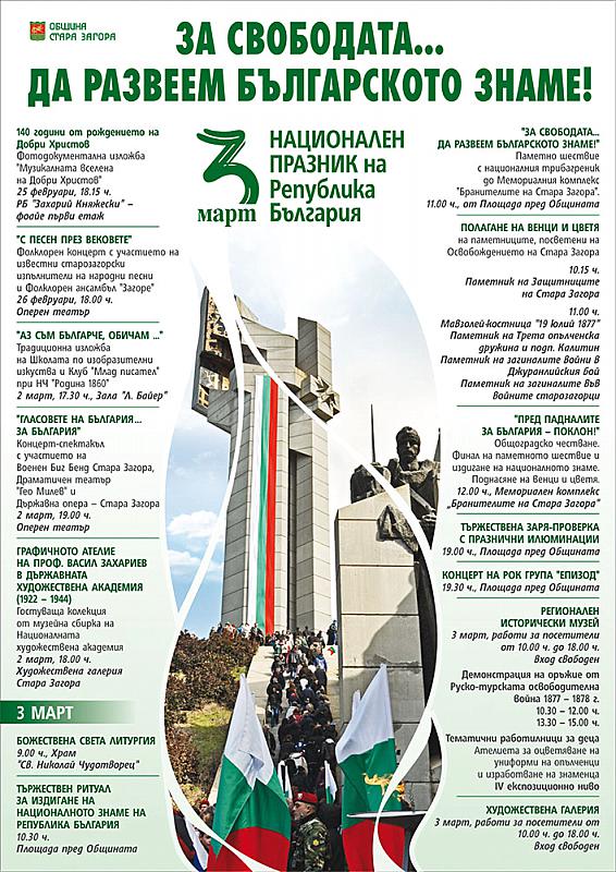 На 3 март - Националният празник на Република България, Община Стара Загора организира за втора поредна година, шествие под надслов "За свободата... Да развеем българското знаме!" с 300-метровия национален трибагреник. Парадът на поклонението пред жертвите, дали живота си за свободата тръгва от площада пред Общината, за да завърши с тържествен ритуал пред Мемориален комплекс "Бранителите на Стара Загора", където през юли 1877 г. Самарското знаме и Българското опълчение получават бойното си кръщение в ожесточена битка за града и свободата на Отечеството. Знамето светиня по традиция се носи от 340 военнослужещи на Втора Тунджанска механизирана бригада.