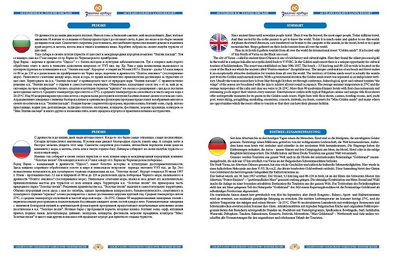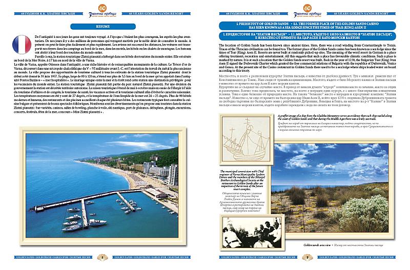 Във връзка с честването на 60-годишнината на комплекса беше издадена юбилейна книга, финансирана от община Варна. В нейните 128 страници са събрани най-важните етапи от изграждането на комплекса, кратка предистория, откриването на първия хотел, директори и дългогодишни служители в к.к. Златни пясъци през годините. Изданието е луксозно с мат ламинирани твърди корици и пълноцветни гланцирани страници, като е и богато илюстрирана с над 800 фотоса. Книгата е двуезична - на български и английски, с резюмета на немски, руски и френски език.