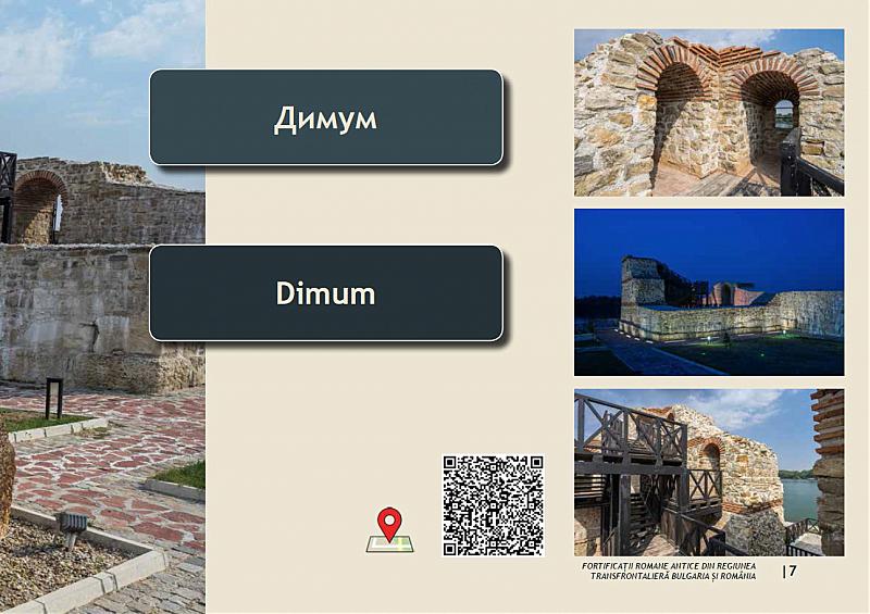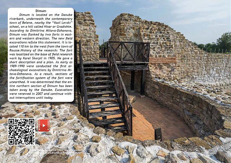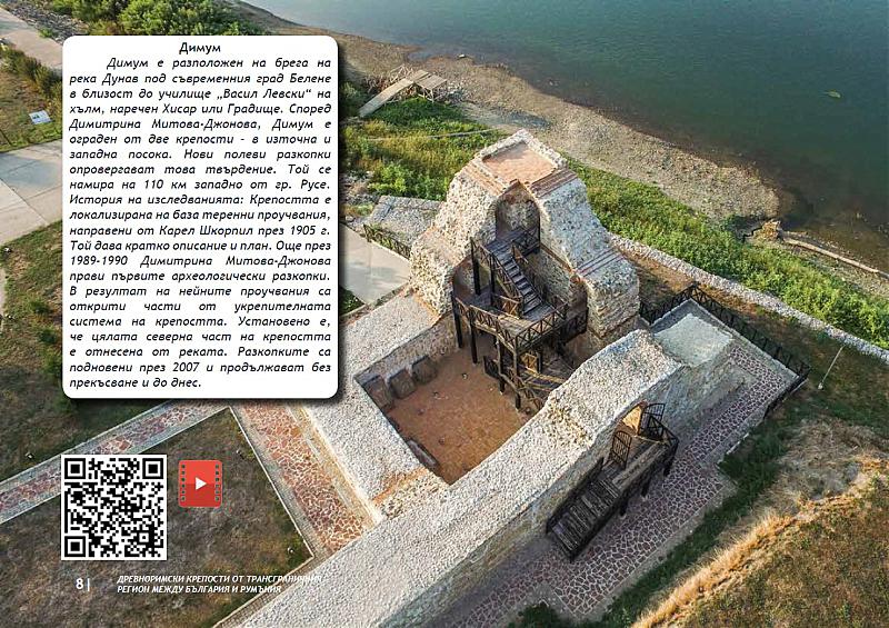 Специализираната интерактивна книга „Древноримски крепости от трансграничния регион между България и Румъния“, съдържа снимки и текстова информация за 16 Римски крепости от трансграничния регион между България и Румъния. Тези крепости са Димум (Белене), Нове (Свищов), Ятрус (с. Кривина), Тримамиум (с. Мечка), Червен, Сексагинта Приста (Русе), Абритус (Разград), Дуросторум (Силистра), Тропеум Траяни (Адамклиши, Румъния), Сачидава (Румъния), Капидава (Румъния), Карсиум (Хърсово, Румъния), Улметум (Пантейлемон, Румъния), Хистрия (Румъния), Томис (Констанца, Румъния) и Калатис (Мангалия, Румъния). Книгата е с обем от 104 страници.