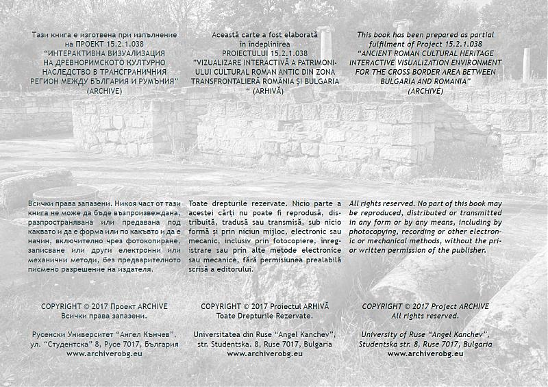 Работата по книгата е извършена в периода май - октомври 2017 г. и е осъществена в рамките на проект 15.2.1.038 ARCHIVE - Интерактивна визуализация на древноримското културно наследство в трансграничния регион между България и Румъния (Ancient Roman Cultural Heritage Interactive Visualization Environment for the cross border area between Bulgaria and Romania), съфинансиран от Европейския съюз чрез Европейския фонд за регионално развитие в рамките на Програмата Interreg V-A Румъния-България. Повече информация за проект ARCHIVE можете да намерите на официалната му страница – www.archiverobg.eu.