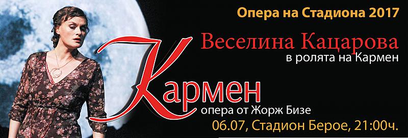 Най-популярната опера за всички времена „Кармен” от Жорж Бизе е изборът на Държавна опера - Стара Загора за второто издание на „Опера на стадиона“. Грандиозната продукция на любимото оперно заглавие е представена на 6 юли от 21.00 ч. на специално построена огромна сцена на стадион „Берое“. Спектакълът се дирижира Ивайло Кринчев, режисьор Огнян Драганов. Атрактивните балетни платна с участието на балета на Държавна опера -Стара Загора са дело на примабалерината и хореограф Силвия Томова. Сценографията е подготвена и адаптирана от художника на Старозагорската опера Тодор Демеров за гигантската сцена на стадиона.