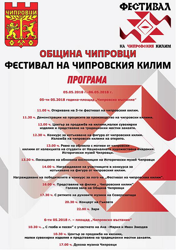 На 5-6 май 2018 г. Община Чипровци съвместно с Исторически музей -Чипровци и НЧ „Петър Богдан – 1909 г.” за пети пореден път организира „Фестивал на чипровския килим”, който е със свободен достъп за зрители и участници. Програмата е наситена с разнородни събития за всички възрасти и интереси – изложби, ревюта, демонстрации, прожекции на документални филми, свързани с чипровския килим.