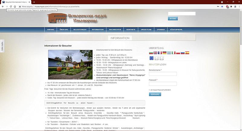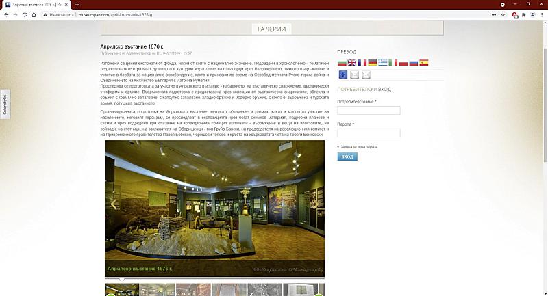На уебсайта са показани, както историята на Панагюрския край, така и информация за актуалните събития. Тя е структурирана спрямо тематиката на музея в отделни панели, свързани логически помежду си. Чрез снимки, текст, виртуална разходка и видео той е представен по най-добрия начин, с което да бъдат привличани гости на музейната институция и общината, потенциални партньори и служители. С определянето на ключови думи и фрази за SEOоптимизация на сайта постигаме популярност в интернет пространството. Актуалната информация и навременното отразяване на събитията спомага за допълнителното промотиране на дейността ни.