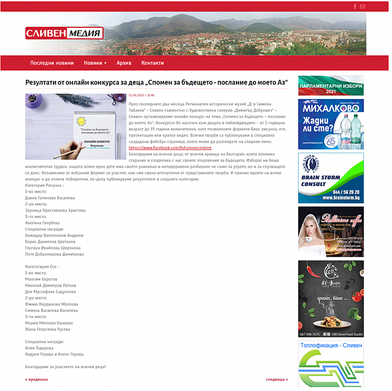 Една от инициативите на Регионален исторически музей „Д-р Симеон Табаков“ – Сливен през изминалата 2020 г. е „Спомен за бъдещето – послание до моето Аз“, онлайн конкурс, организиран от РИМ – Сливен и Художествена галерия „Димитър Добрович“ – Сливен. В желанието си да отклоним вниманието на най-малките представители на нашето общество от глобалната пандемия и да им дадем възможност да изразят чувствата си под една или друга форма, предложихме на ХГ „Димитър Добрович“ да се обединим в организацията на онлайн конкурса.