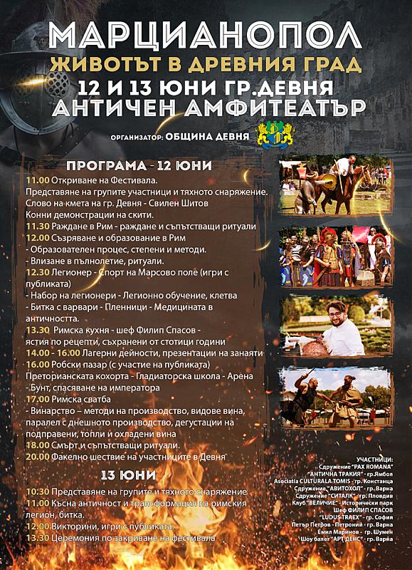 Община Девня бе домакин на петото подред издание на Фестивала „Марцианопол – животът в Древния град“ на 12 и 13 юни 2021 г. Събитието се проведе в Античния амфитеатър в кв. „Река Девня“. В него се включиха близо 120 участници от България и Румъния. В рамките на два дни градът се превърна в арена на гладиаторски борби и демонстрации на римски военни строеве, оръжия, римска кухня и ритуали. Групите представиха пред публиката истински спектакъл, който я поведе на вълнуваща разходка през вековете.