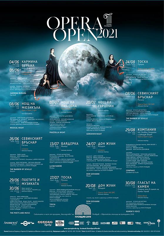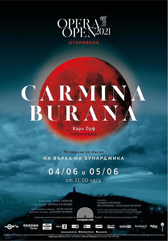04.06, 05.06, 09.09 и 10.09 – Откриване на OPERA OPEN 2021 с „Кармина Бурана” на Карл Орф – премиера на хълм Бунарджик. Диригент: Емил Табаков; Диригент на хора: Драгомир Йосифов; Хореограф: Боряна Сечанова; Солисти: Пламена Гиргинова, Иво Йорданов, Александър Баранов; Балет, Оркестър и Хор на Опера Пловдив; Хор на Детска Академия към Опера Пловдив.
