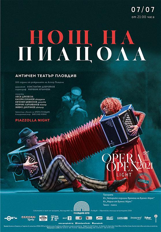 07.07 – „Нощ на Пиацола” – Античен театър. Диригент: Константин Добройков; Балет, Хор и Оркестър на Опера Пловдив.