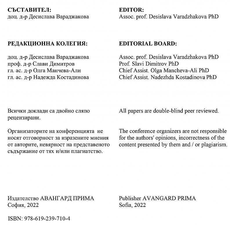 Сборникът с доклади е издаден в електронен формат и е с има обем 1011 страници, ISBN: 978-619-239-710-4, издателство „Авангард прима“, 2022 г.