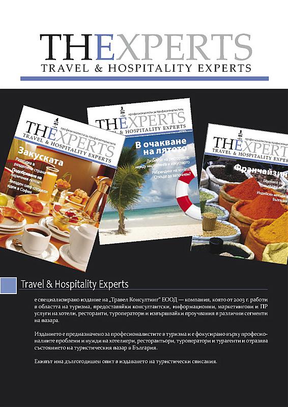 TRAVEL & HOSPITALITY EXPERTS e специализиран портал за професионалистите в туристическата индустрия. Наши читатели са над 5000 представители на туристическия бизнес в България: собственици и управители на хотели и ресторанти, туроператори, турагенти, браншови организации, Съвети по туризъм, общини, компании доставчици и пр.