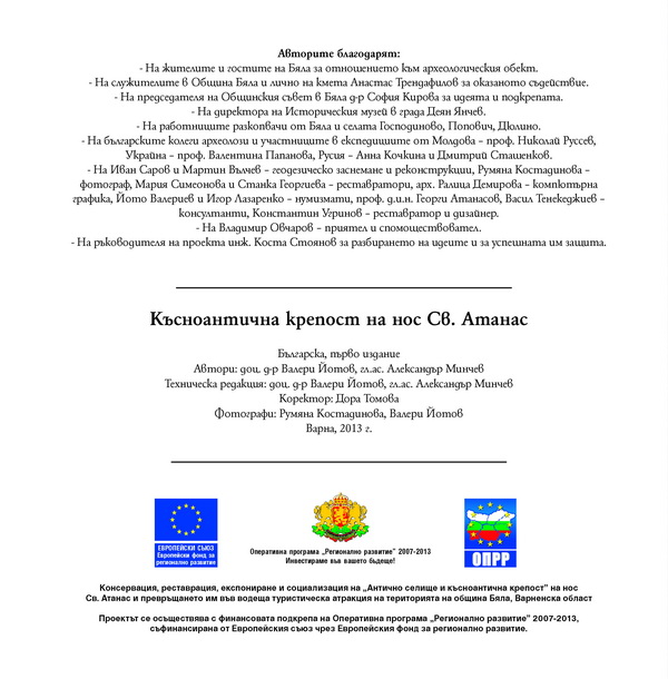 Тази книга е създадена в рамките на проект „Консервация, реставрация, експониране и социализация на антично селище и късноантична крепост на нос Св. Атанас и превръщането им във водеща туристическа атракция на територията на Община Бяла, обл. Варна“ финансиран по ОП „Регионално развитие“ 2007 – 2013 г.