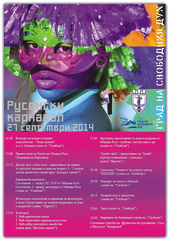 На 27 септември 2014 г. забавни игри, костюми, атрактивни изпълнения, огнено шоу, митични същества и куп интересни герои изпълниха централния площад на Русе. Над 500 участници се включиха в Карнавала. Карнавалното шествие се състоеше от три лъча, а три сцени осигуряваха забавление за малки и големи до вечерта. Програмата на карнавала включваше и различни конкурси – за най-оригинална маска, за най-атрактивен костюм, за най-добре маскирано семейство, а общият награден фонд за всички състезания беше 3000 лева.