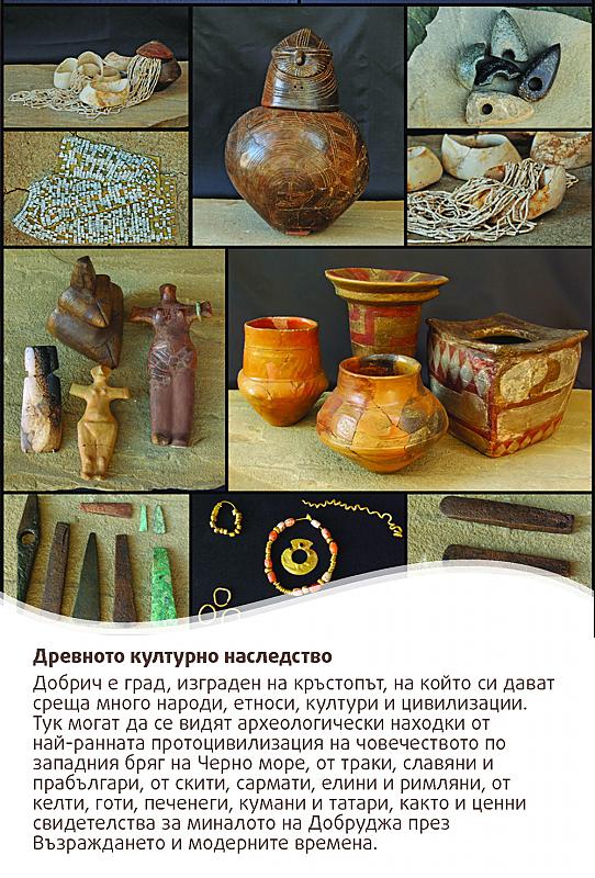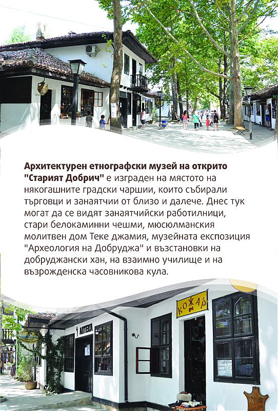 В Историческия музей в Добрич ще види най-старото обработено злато в света от каменно-медната епоха, а в Етнографския комплекс на открито „Стария Добрич“ ще се потопи в света на старите български занаяти и традиции. А фестивалите на Добруджа ще го срещнат със словото, класическата музика, рока, балета и фолклорните традиции…. и ще поиска да започне своето пътуване с „Пъстрото лице на Добруджа“.