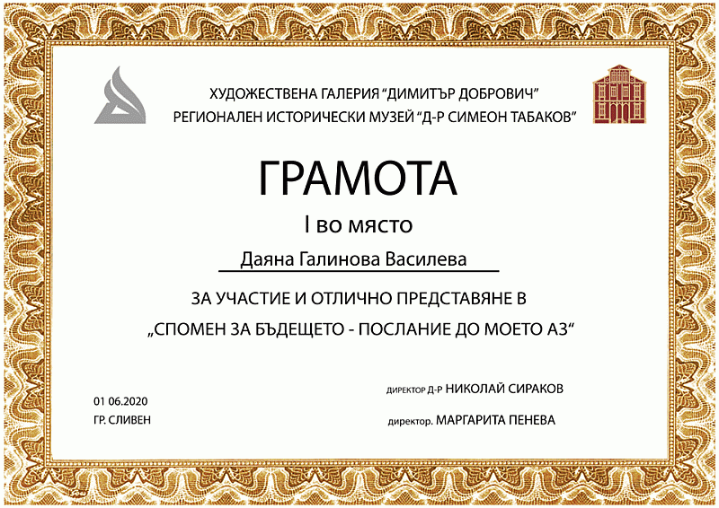 Една от инициативите на Регионален исторически музей „Д-р Симеон Табаков“ – Сливен през изминалата 2020 г. е „Спомен за бъдещето – послание до моето Аз“, онлайн конкурс, организиран от РИМ – Сливен и Художествена галерия „Димитър Добрович“ – Сливен. В желанието си да отклоним вниманието на най-малките представители на нашето общество от глобалната пандемия и да им дадем възможност да изразят чувствата си под една или друга форма, предложихме на ХГ „Димитър Добрович“ да се обединим в организацията на онлайн конкурса.