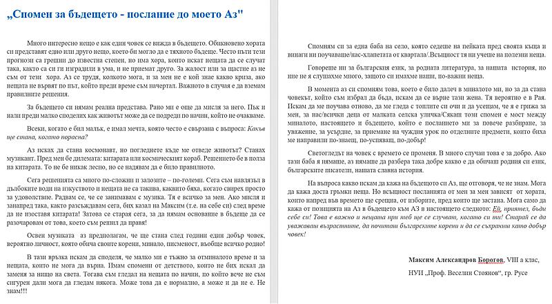 2020: Онлайн конкурс „Спомен за бъдещето – послание до моето Аз“