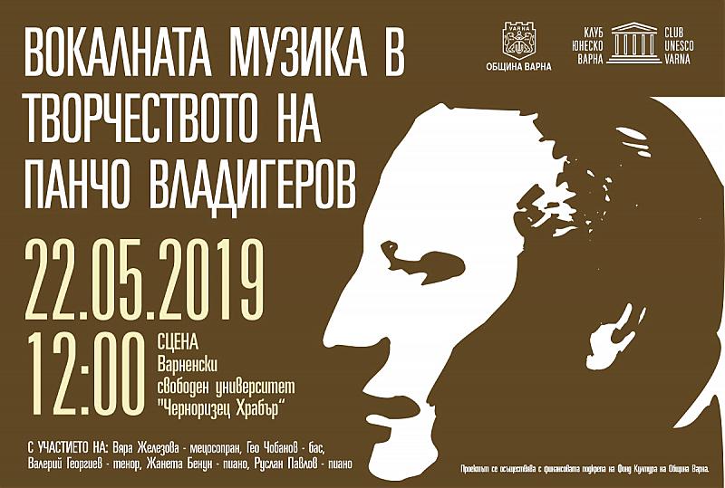 Празничният концерт „Вокалната музика в творчеството на Панчо Владигеров“, посветен на 120-годишнината от рождението на Панчо Владигеров е организиран от Клуб ЮНЕСКО - Варна на 22 май 2019 г. във ВСУ „Черноризец Храбър“. В концерта участваха солистите от Варненската опера: Гео Чобанов - бас, Вяра Железова - мецосопран, Валерий Георгиев - тенор, на пиано акомпанираха: Жанета Бенун и Руслан Павлов. Солистите на Варненската опера вдигнаха на крака публиката на празничния концерт „Вокалната музика в творчеството на Панчо Владигеров”.