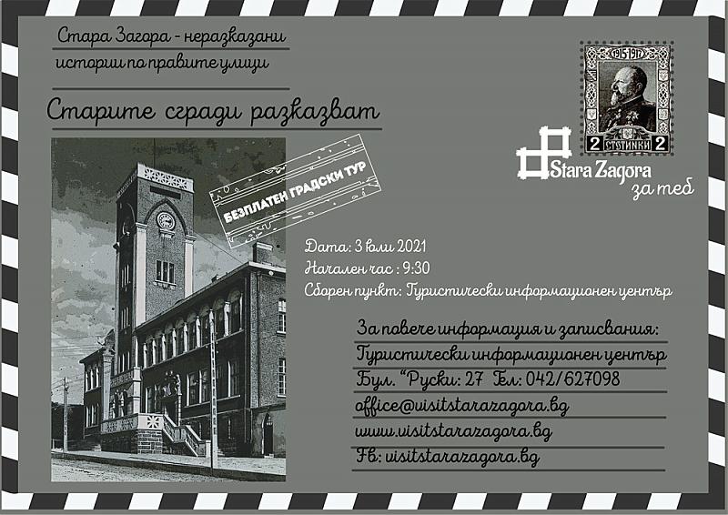 ПЛАКАТ НА МАРШРУТ С ТЕМА „СТАРИТЕ СГРАДИ РАЗКАЗВАТ“ В „БЕЗПЛАТНИ ГРАДСКИ ТУРОВЕ „СТАРА ЗАГОРА – НЕРАЗКАЗАНИ ИСТОРИИ ПО ПРАВИТЕ УЛИЦИ“
