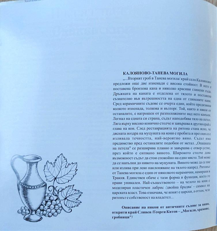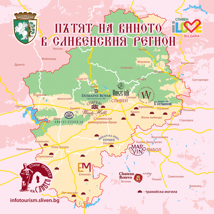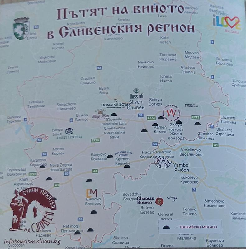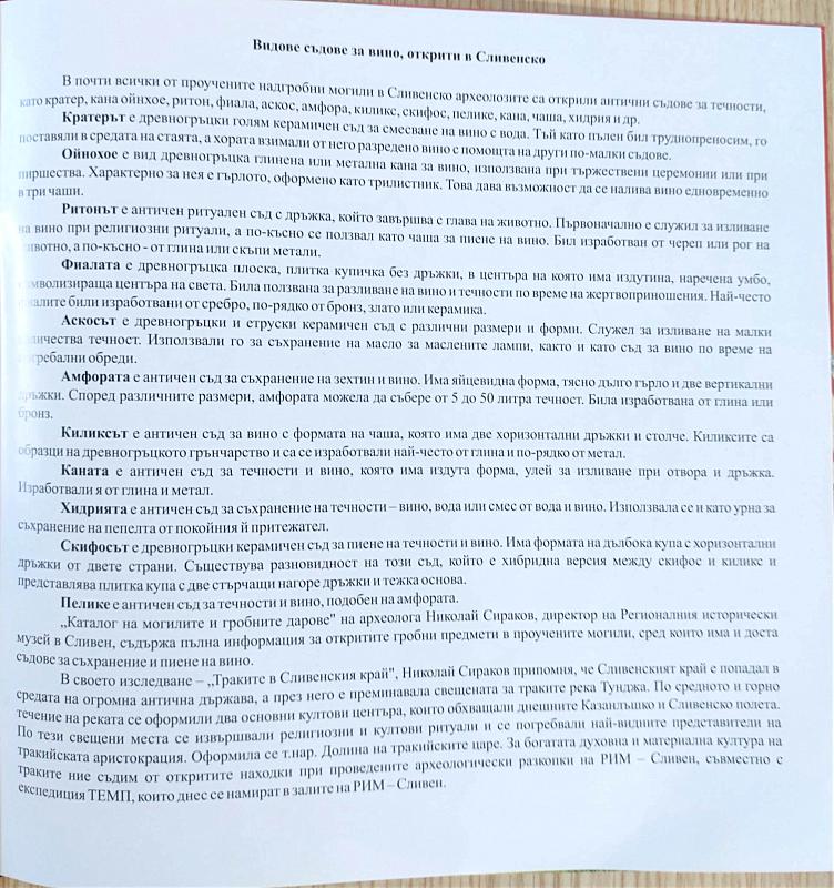 Пътеводителят „Пътят на виното в Сливенския край“ включва интересни текстове за виното, за видовете съдове за вино, открити от археолозите край Сливен, легенди и древни български предания за напитката на боговете и др.