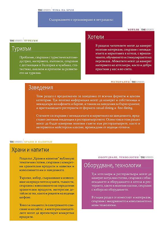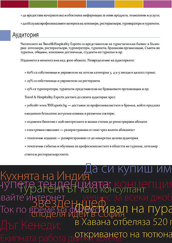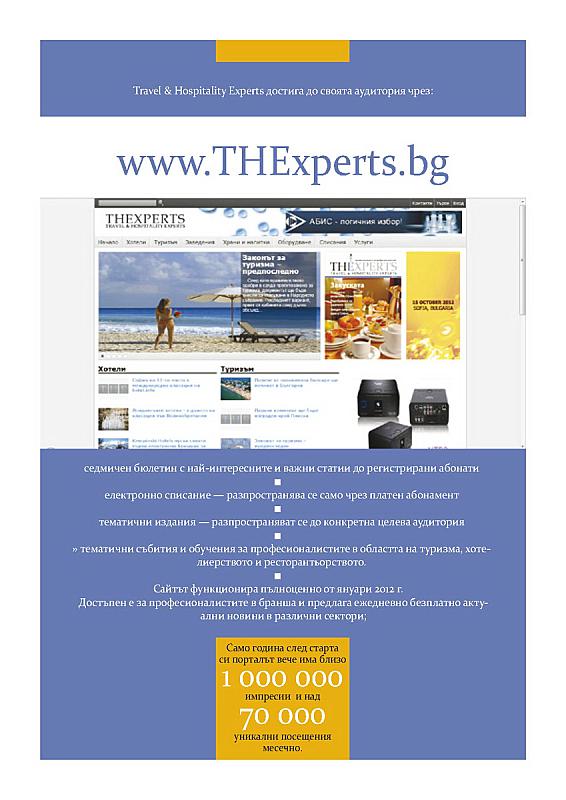 TRAVEL & HOSPITALITY EXPERTS e специализиран портал за професионалистите в туристическата индустрия. Наши читатели са над 5000 представители на туристическия бизнес в България: собственици и управители на хотели и ресторанти, туроператори, турагенти, браншови организации, Съвети по туризъм, общини, компании доставчици и пр.
